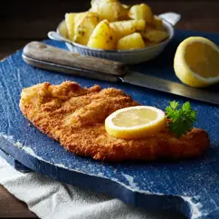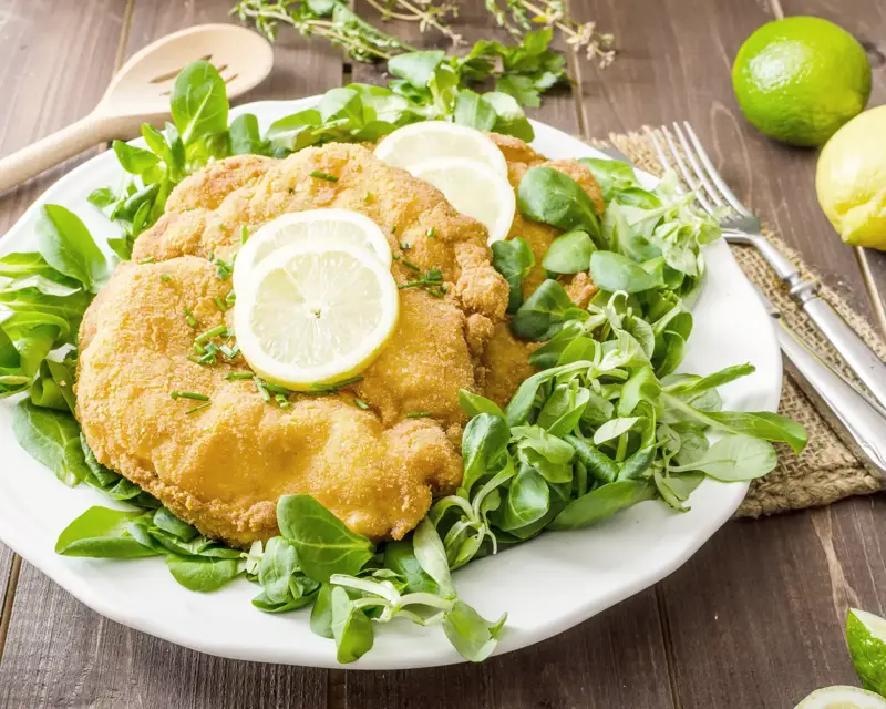 - Klassisches Schnitzel mit Champignonsauce, serviert mit Pommes, Gemüse und Apfelmus mit Kirsche