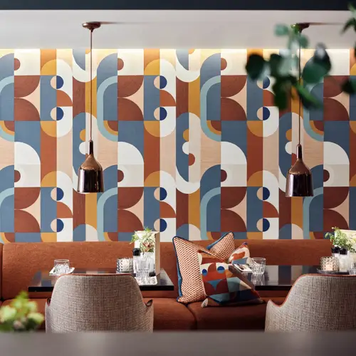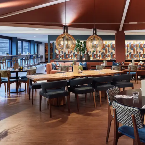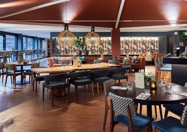In our Brasserie, we have created a warm, inviting atmosphere with a refined design. Stylish geometric patterns on the walls and the use of earth tones provide a modern, yet homely look. Discover the new style of the brasserie here!
