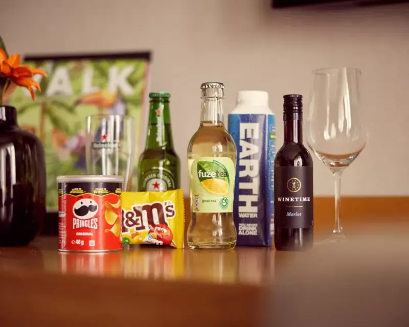 Het minibarpakket kan gevuld worden met een keuze uit 4 drankjes of 1 fles wijn en 2 snacks: